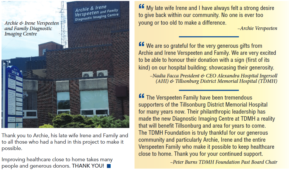 Archie Verspeeten and his late wife Irene, have supported TDMH for several years. Most recently, the Verspeeten family have come forward with a transformational gift to fund the much needed new equipment for the Diagnostic Imaging Centre at Tillsonburg District Memorial Hospital.